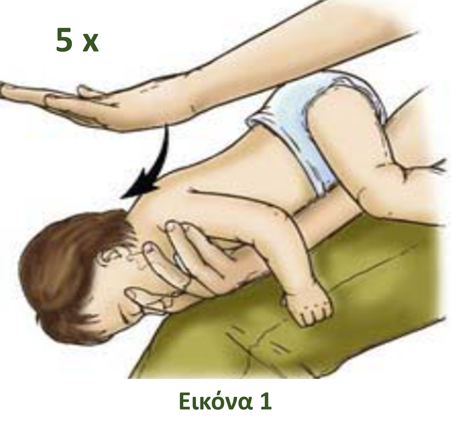 Δεύτερον, καθίστε σε μια καρέκλα και τοποθετήστε το βρέφος ή το παιδάκι μπρούμυτα πάνω στο μηρό σας, με το κεφαλάκι του προς τα κάτω. Δώστε τέσσερα-πέντε δυνατά χτυπήματα στην πλάτη. Μπορείτε να επαναλάβετε τη διαδικασία δύο με τρεις φορές (εικόνα 1).