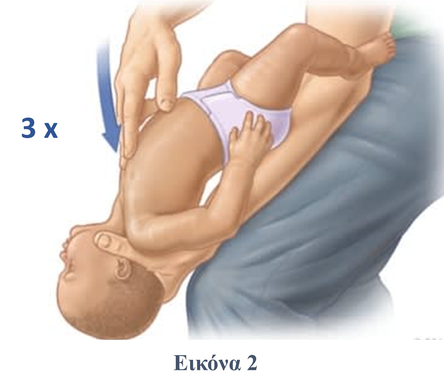 Εάν η μέθοδος αυτή δεν αποδώσει, γυρίστε το βρέφος ανάσκελα και τοποθετήστε το πάλι πάνω στο μηρό σας, με το κεφαλάκι του χαμηλότερα από το σώμα. Με δύο τεντωμένα δάκτυλα, πιέστε δυνατά προς τα κάτω το σημείο κάτω από το στέρνο, τρεις-τέσσερις φορές (εικόνα 2).